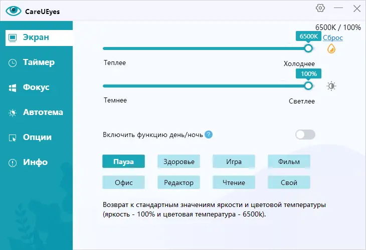 CareUEyes — это приложение для снижения нагрузки на глаза при длительной работе за компьютером. Оно регулирует цветовую температуру и яркость экрана, а также напоминает делать перерывы. Программа подходит для пользователей, проводящих за монитором много времени, особенно в вечерние и ночные часы. Она помогает снизить утомление глаз и улучшить качество сна за счёт уменьшения синего света.