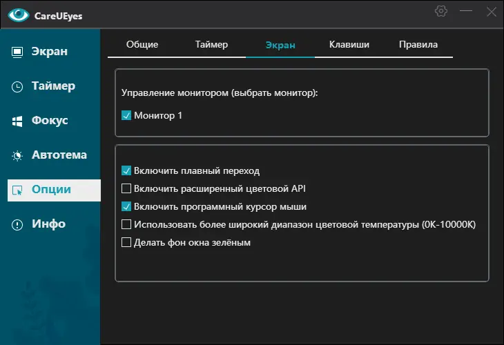 Программа CareUEyes разработана для защиты зрения при продолжительной работе с компьютером. Она корректирует цветовой баланс дисплея, уменьшая долю синего света, особенно в вечернее и ночное время, что положительно сказывается на циркадных ритмах и общем самочувствии. Утилита поддерживает гибкое управление параметрами отображения, включая ручную настройку яркости и температуры, а также автоматическое переключение между предустановленными режимами.