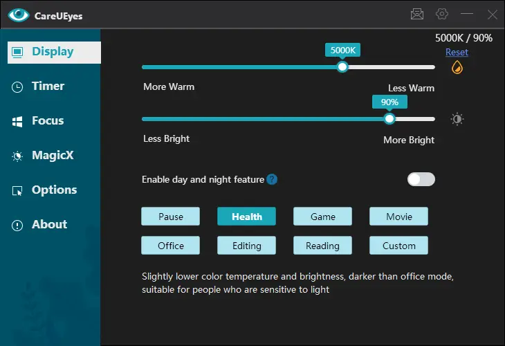 CareUEyes — это утилита, разработанная для снижения утомления глаз при постоянной работе с компьютером. Она корректирует отображение изображения на экране в зависимости от времени суток и выбранного режима, минимизируя вредное воздействие синего света. Программа проста в использовании и не требует глубокого понимания технических настроек, что делает её идеальной для широкого круга пользователей.