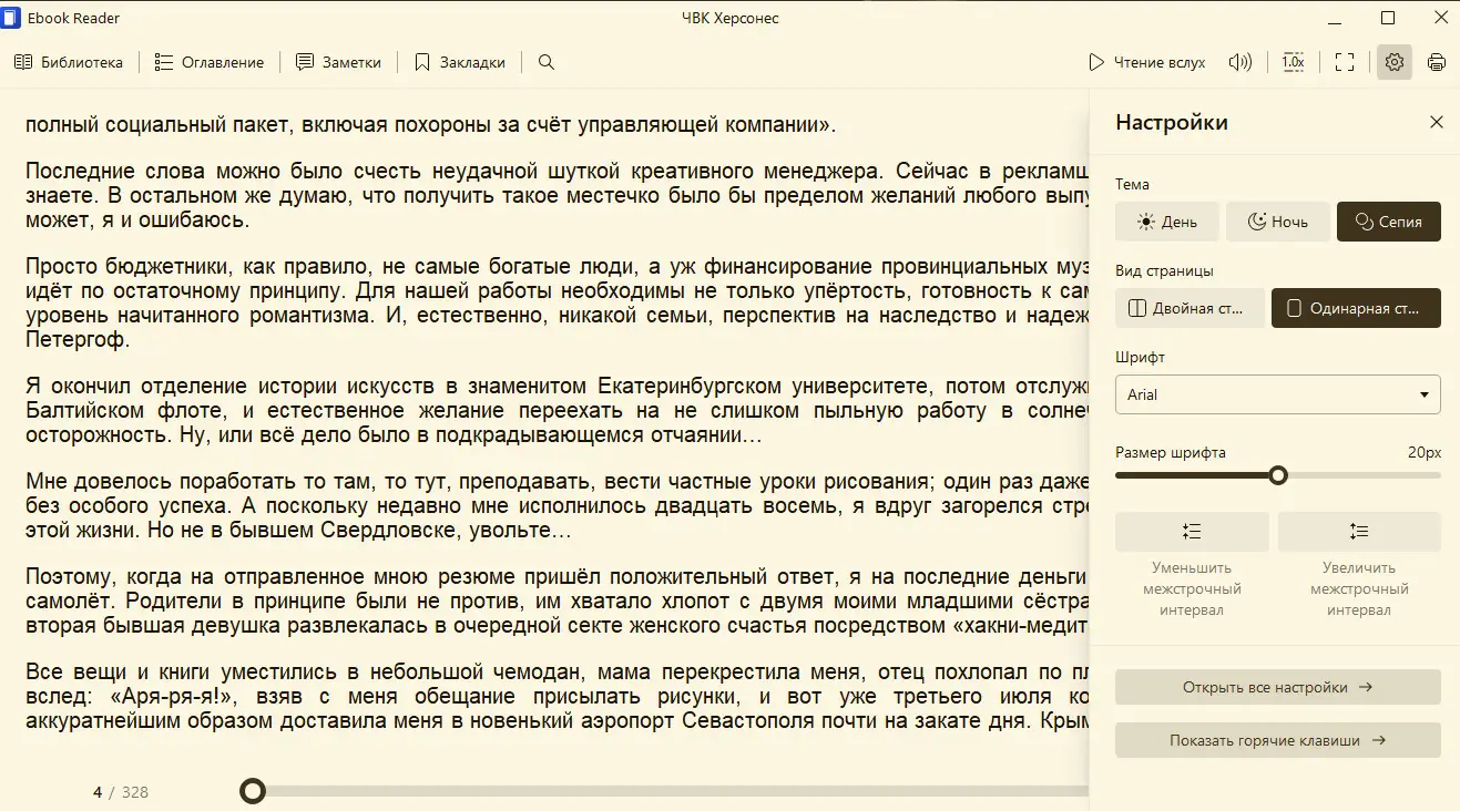 После запуска приложение автоматически сканирует указанные папки на наличие электронных книг и формирует библиотеку. Открытие файлов происходит в один клик, а навигация по содержанию упрощена благодаря боковой панели. Пользователь может перелистывать страницы мышью, клавишами или жестами, имитируя поведение реальной книги. В меню настроек доступны параметры отображения, включая выбор темы (дневная/ночная), управление отступами и смену шрифта. Добавление закладок позволяет быстро возвращаться к важным фрагментам, а заметки сохраняются в отдельной вкладке для удобного доступа. Встроенный инструмент поиска находит слова и фразы по всей книге, а копирование текста в буфер обмена работает без задержек. Для тех, кто предпочитает слушать, функция TTS позволяет настроить голос и скорость чтения, что особенно полезно при длительных поездках или отдыхе.