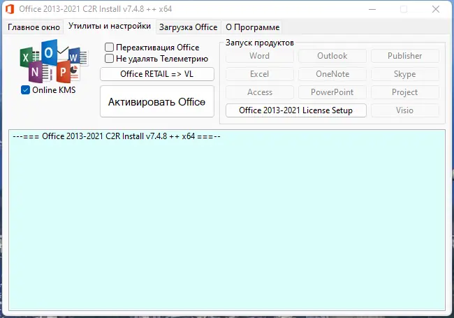 Программа для установки Microsoft Office 2013–2021 с поддержкой выбора языка, разрядности и компонентов. Позволяет создать оффлайн-дистрибутив и активировать пакет. Подходит для систем на базе windows с различными настройками.