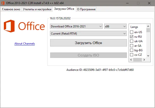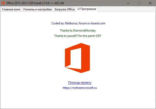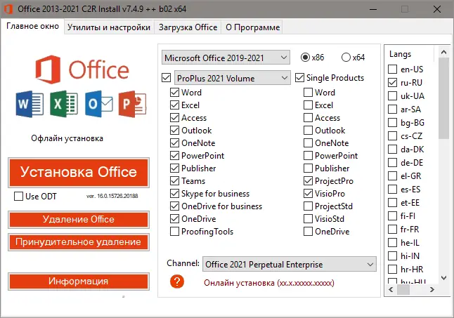 Инструмент для установки Microsoft Office 2013–2021 с поддержкой выбора версии, языка и разрядности. Позволяет создать офлайн-дистрибутив и активировать пакет через KMS или конвертировать в Volume-редакцию. Подходит для систем на базе windows с архитектурой x86 и x64.