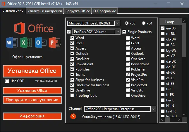 Инструмент предназначен для установки пакета Office с 2013 по 2021 версию через Click-to-Run. Он позволяет гибко настраивать процесс инсталляции, выбирая нужные компоненты. Поддерживается установка как 32-, так и 64-битных версий. Пользователь может указать предпочитаемый язык интерфейса. Программа также даёт возможность активировать офисные приложения. Это достигается через встроенные утилиты или внешние активаторы. Интерфейс простой и интуитивно понятный, не требует глубоких технических знаний. Утилита работает в режиме онлайн, загружая файлы напрямую с серверов ms. Также можно подготовить установочный пакет для последующего использования без интернета.
