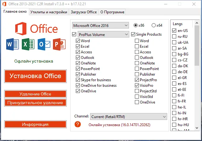 Утилита для установки и настройки офисного пакета Microsoft Office 2013–2021 с поддержкой выбора компонентов, языков и активации. Позволяет как выполнить онлайн-установку, так и создать полноценный оффлайн-дистрибутив для последующего развертывания без подключения к интернету. Интерфейс адаптирован под стиль Windows 10, обеспечивая интуитивное взаимодействие и расширенные настройки.