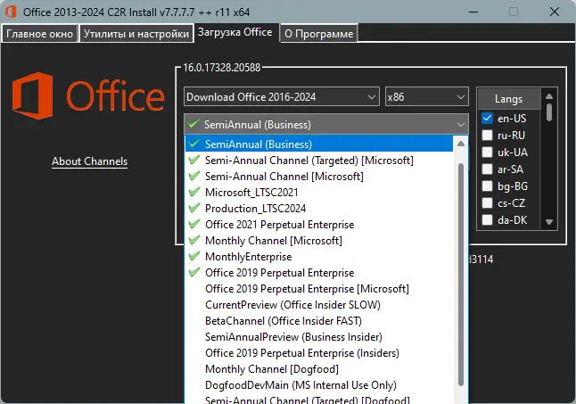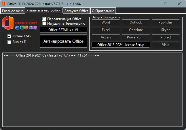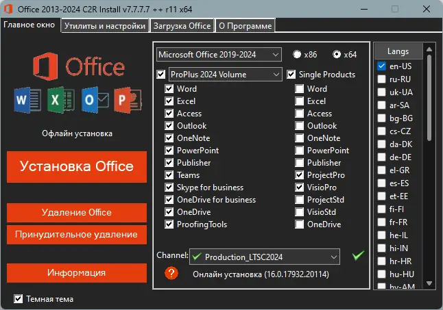 Программа для установки Microsoft Office 2013–2021 включая полные и сжатые редакции с возможностью выбора языка, разрядности и активации. Поддерживает создание оффлайн-дистрибутивов и гибкую настройку компонентов. Установка происходит онлайн, но также доступен режим загрузки пакета для последующего развертывания без подключения к интернету. Утилита позволяет конвертировать редакции, активировать продукт и использовать дополнительные инструменты для управления установкой.