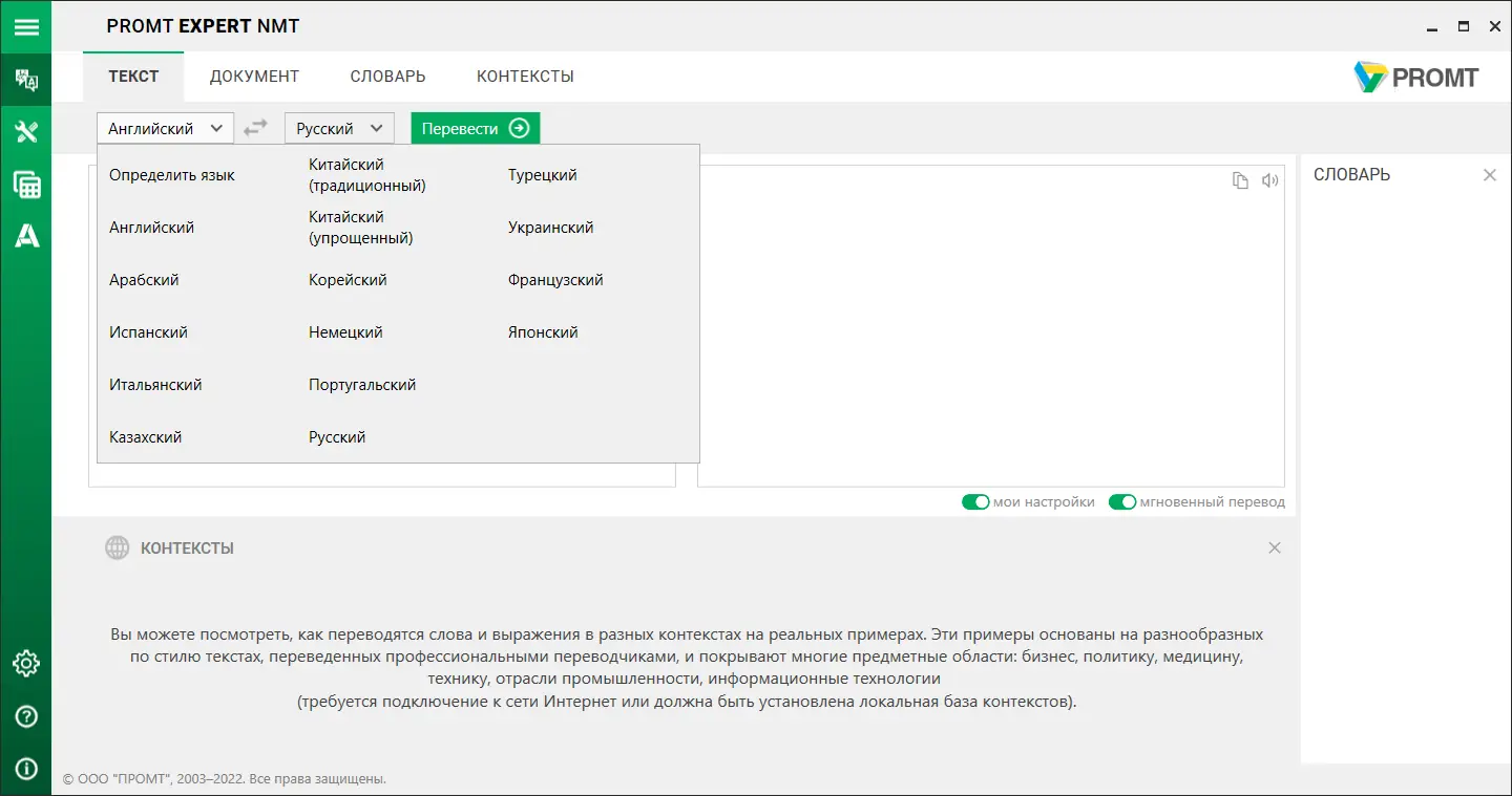 PROMT Expert NMT создан для пользователей, которым требуется надёжный и автономный инструмент перевода без зависимости от интернет-соединения. Система построена на технологии nmt, что позволяет достигать высокого качества трансляции за счёт глубокого анализа контекста и синтаксических конструкций. Программа поддерживает широкий спектр языков, включая европейские, азиатские и ближневосточные, что делает её универсальной для международной коммуникации. Архитектура nmt 23 обеспечивает улучшенную обработку длинных предложений и специализированной терминологии.