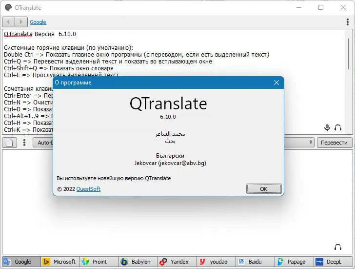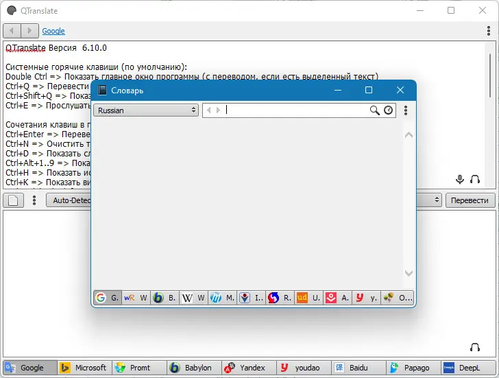 QTranslate — это компактный инструмент для быстрого перевода текста с поддержкой множества онлайн-сервисов. Программа работает в фоне и позволяет переводить выделенные фрагменты одним нажатием клавиш, не прерывая рабочий процесс. Поддержка популярных переводчиков, таких как Google, DeepL и Yandex, делает её универсальным решением для пользователей, работающих с иностранными языками.