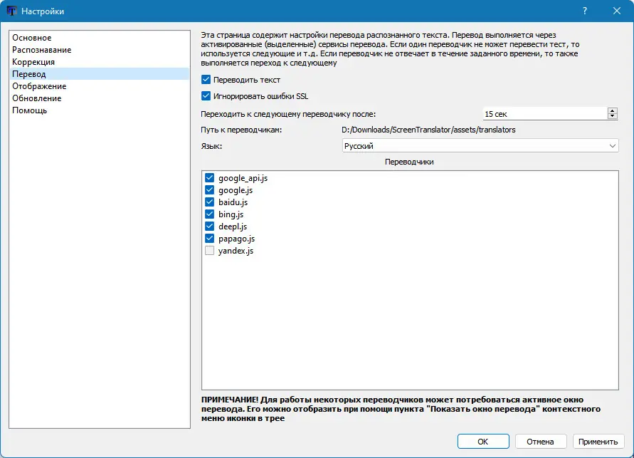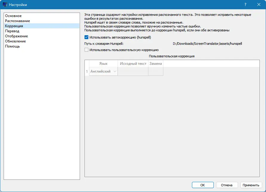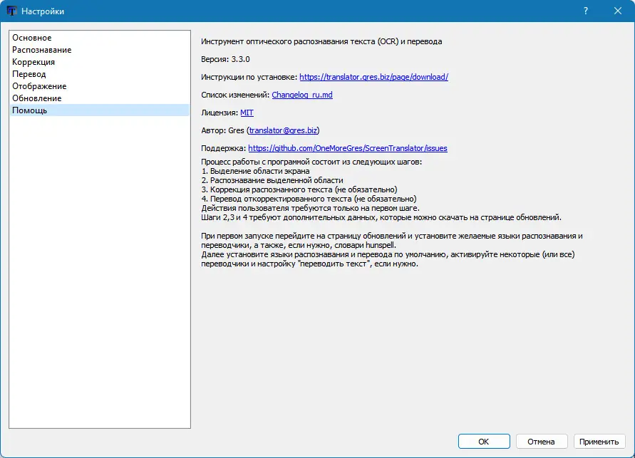 Чтобы начать использовать Screen Translator, сначала нужно правильно настроить язык распознавания и указать целевой язык перевода. После установки всех необходимых компонентов через вкладку «Обновления», пользователь может активировать режим захвата с помощью горячих клавиш или контекстного меню в трее. Выделение области производится мышью, после чего начинается распознавание. Процесс полностью автоматизирован: сначала текст считывается с экрана, затем передаётся в подключённые онлайн-переводчики. Результат можно просматривать повторно, редактировать или копировать. Для более точного перевода доступна ручная коррекция распознанного текста и смена языка. Как пользоваться дополнительными функциями, можно понять из встроенной логики программы — например, удержание Ctrl при выделении откладывает обработку, а клик по иконке в трее быстро показывает последний результат.
