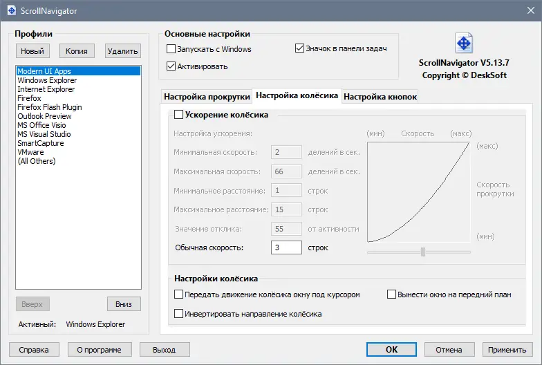 - Настраиваемое динамическое ускорение колеса мыши