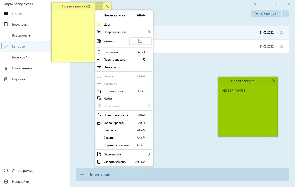 - Заметки можно закреплять поверх всех окон, что особенно полезно при работе с несколькими приложениями одновременно.