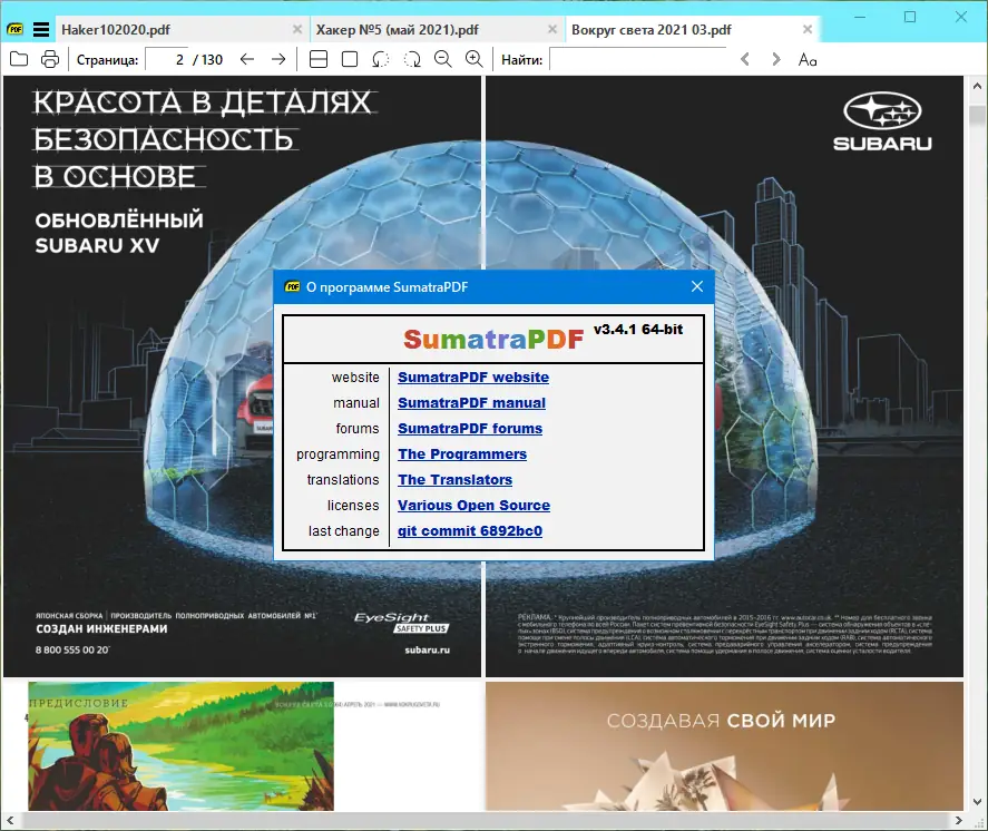 Sumatra PDF — легковесная и быстрая программа для просмотра документов различных форматов, включая PDF, DjVu, FB2, ePub, MOBI, CHM, XPS и архивы CBR/CBZ. Приложение работает на базе движка MuPDF и отличается минимальным потреблением ресурсов, простым интерфейсом и поддержкой портативного режима. Благодаря открытому исходному коду и лицензии GNU GPL, её можно свободно использовать и модифицировать.