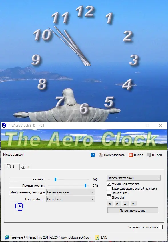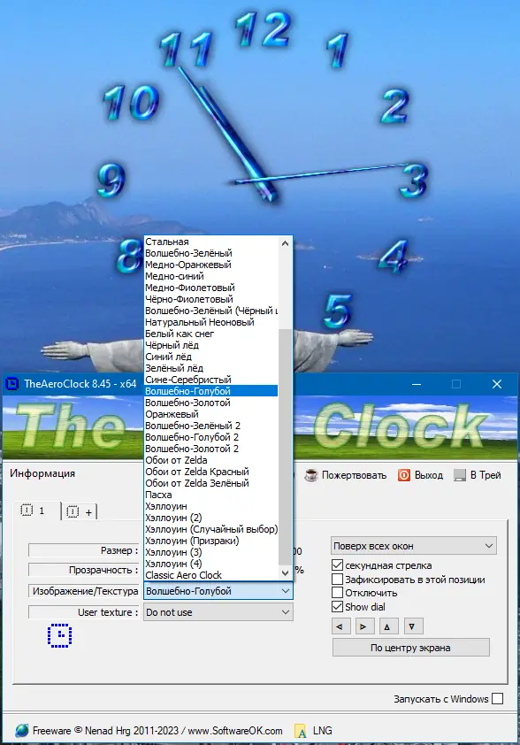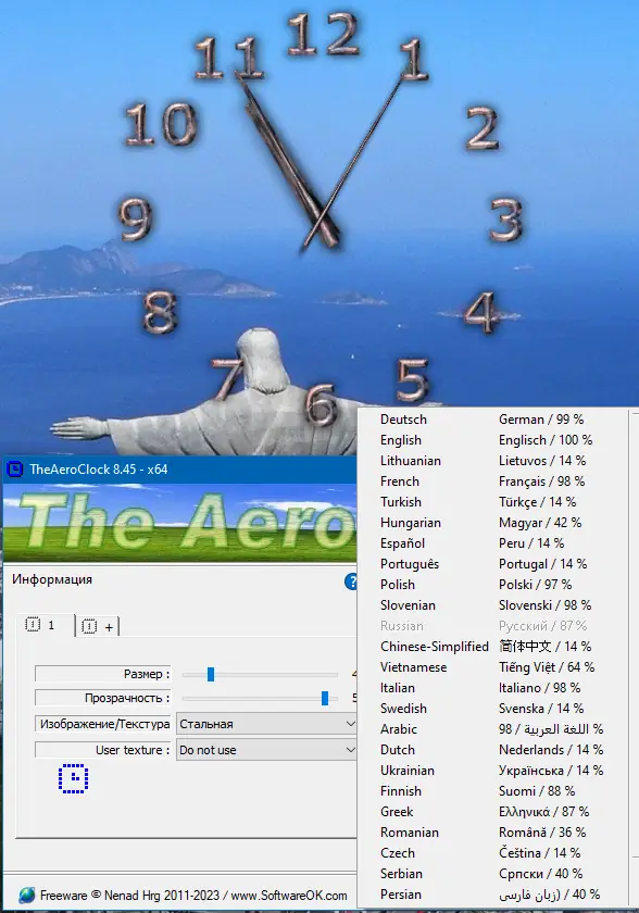 TheAeroClock — это легковесная портативная утилита, позволяющая разместить на рабочем столе стильные часы с полной настройкой внешнего вида. Программа поддерживает регулировку прозрачности, размера, текстуры и положения, а также может запускаться вместе с системой и оставаться поверх всех окон.