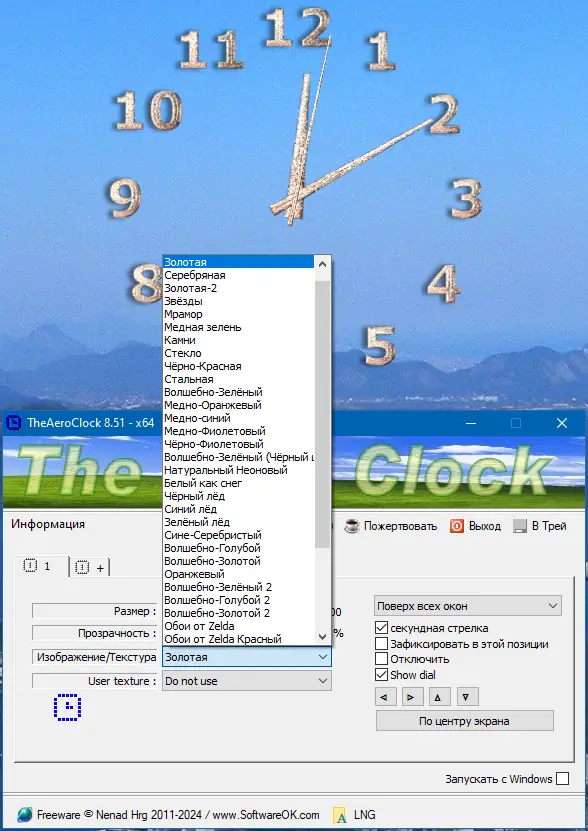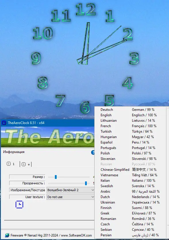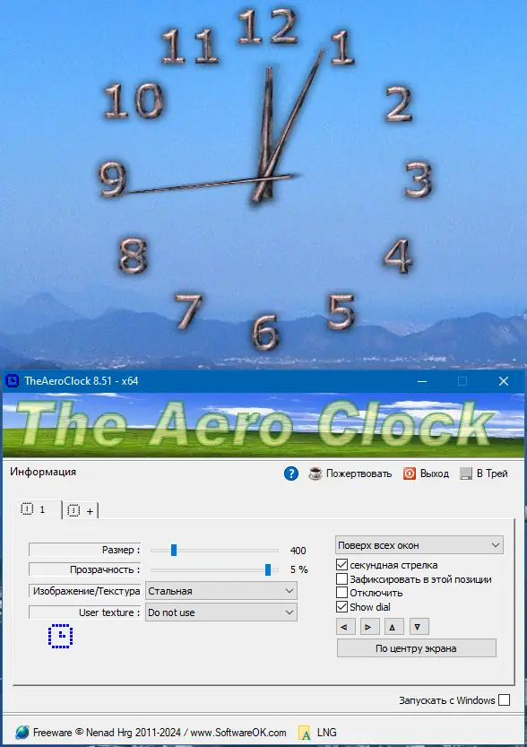 TheAeroClock — это легковесная портативная утилита, позволяющая разместить на рабочем столе стильные часы с регулируемой прозрачностью, размером, текстурой и возможностью отображения поверх всех окон. Программа не требует установки, работает на всех актуальных версиях Windows и легко настраивается под индивидуальные предпочтения. Идеальное решение для пользователей, ценящих минимализм, функциональность и визуальную гармонию рабочего пространства.