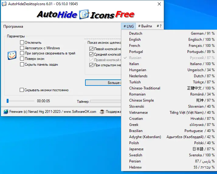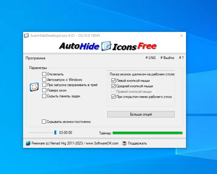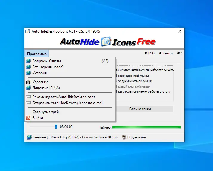 AutoHideDesktopIcons — компактная утилита для автоматического скрытия и отображения иконок на рабочем столе. Программа реагирует на клики по свободной области и позволяет по таймеру управлять видимостью элементов интерфейса.