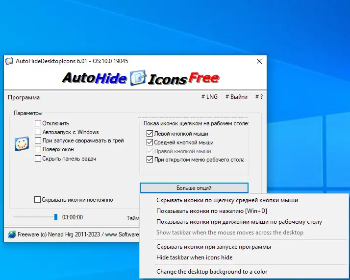 Управление функциями осуществляется через контекстное меню или горячие клики. По умолчанию, левый или правый клик по пустому участку рабочего стола активирует смену состояния — иконки исчезают или появляются. В настройках можно выбрать, какая именно кнопка мыши будет использоваться, а также задать интервал для автоматического сокрытия. Дополнительно доступна возможность скрывать панель задач одновременно с ярлыками, что особенно удобно при просмотре изображений, видео или во время презентаций. Приложение не мешает другим процессам и не вмешивается в системные настройки, работая как независимый фоновый процесс. После запуска оно размещается в области уведомлений, откуда легко доступны все функции и параметры.