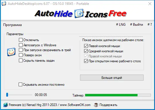 AutoHideDesktopIcons — компактная утилита для управления отображением иконок на рабочем столе и панели задач. Программа позволяет быстро скрывать и показывать элементы интерфейса с помощью простых действий мышью или по расписанию.
