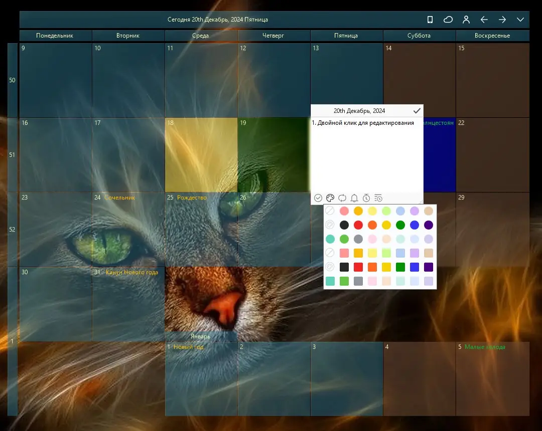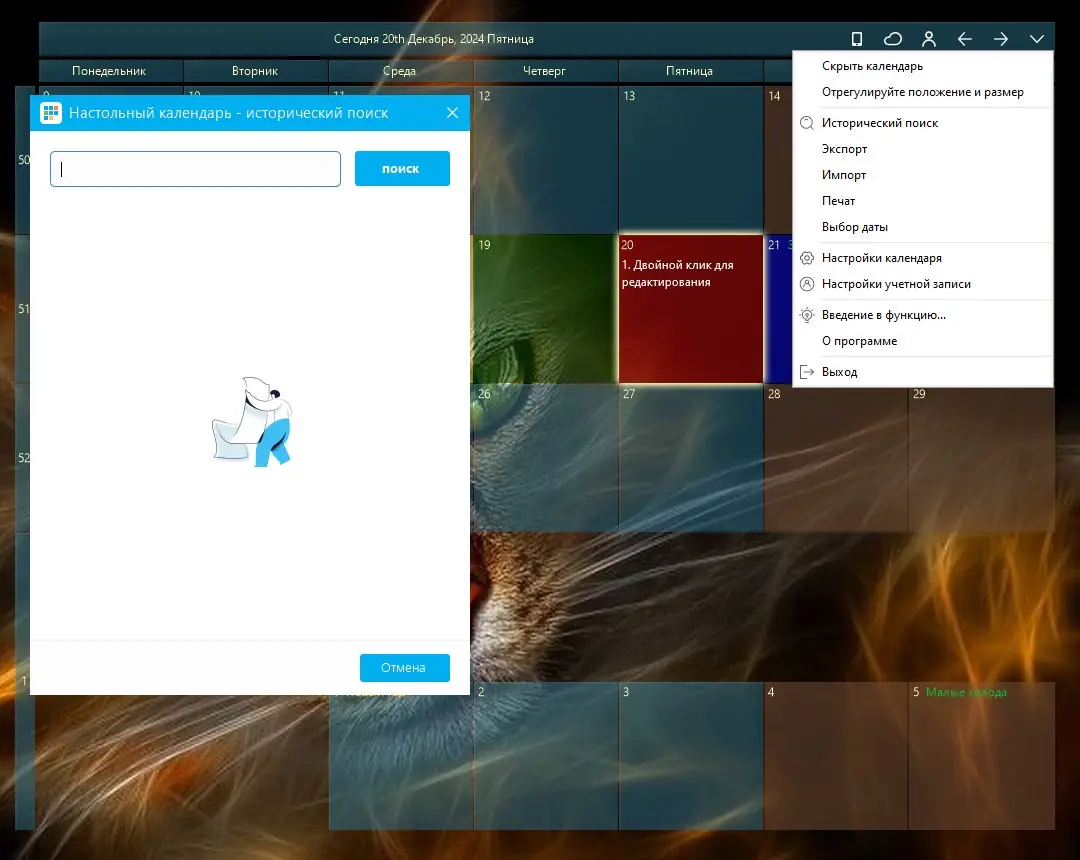 Пользоваться программой легко благодаря продуманному интерфейсу. После запуска календарь появляется на рабочем столе в виде аккуратного виджета, который можно перемещать и масштабировать. Двойной щелчок по дате открывает окно редактирования, где можно добавить событие, задачу или заметку. Для выделения важных дней, таких как праздники или юбилеи, доступна функция цветового маркирования. Размер окна настраивается перетаскиванием углов, что особенно удобно при использовании мониторов с высоким разрешением. Данные можно сохранять локально или экспортировать в файл, что полезно при переходе на другой компьютер. Поддержка active русская локализации обеспечивает комфортное использование для русскоязычных пользователей.