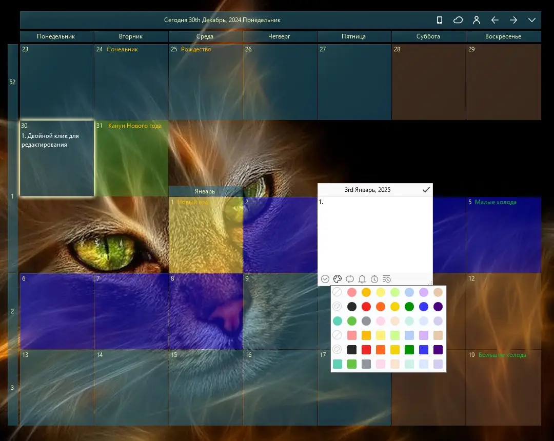 Использование Desktop Calendar не требует специальных навыков. После запуска приложение появляется на рабочем столе в виде компактного окна с текущей датой. Двойной щелчок по дню открывает режим редактирования, где можно добавить задачу, установить напоминание или сделать заметку. Для выделения особого события используется выбор цвета, что помогает визуально структурировать расписание. Окно можно свободно перемещать и изменять его размер, просто растягивая углы. Фиксация окна на переднем плане позволяет не упускать важные события из виду даже при работе с другими приложениями.