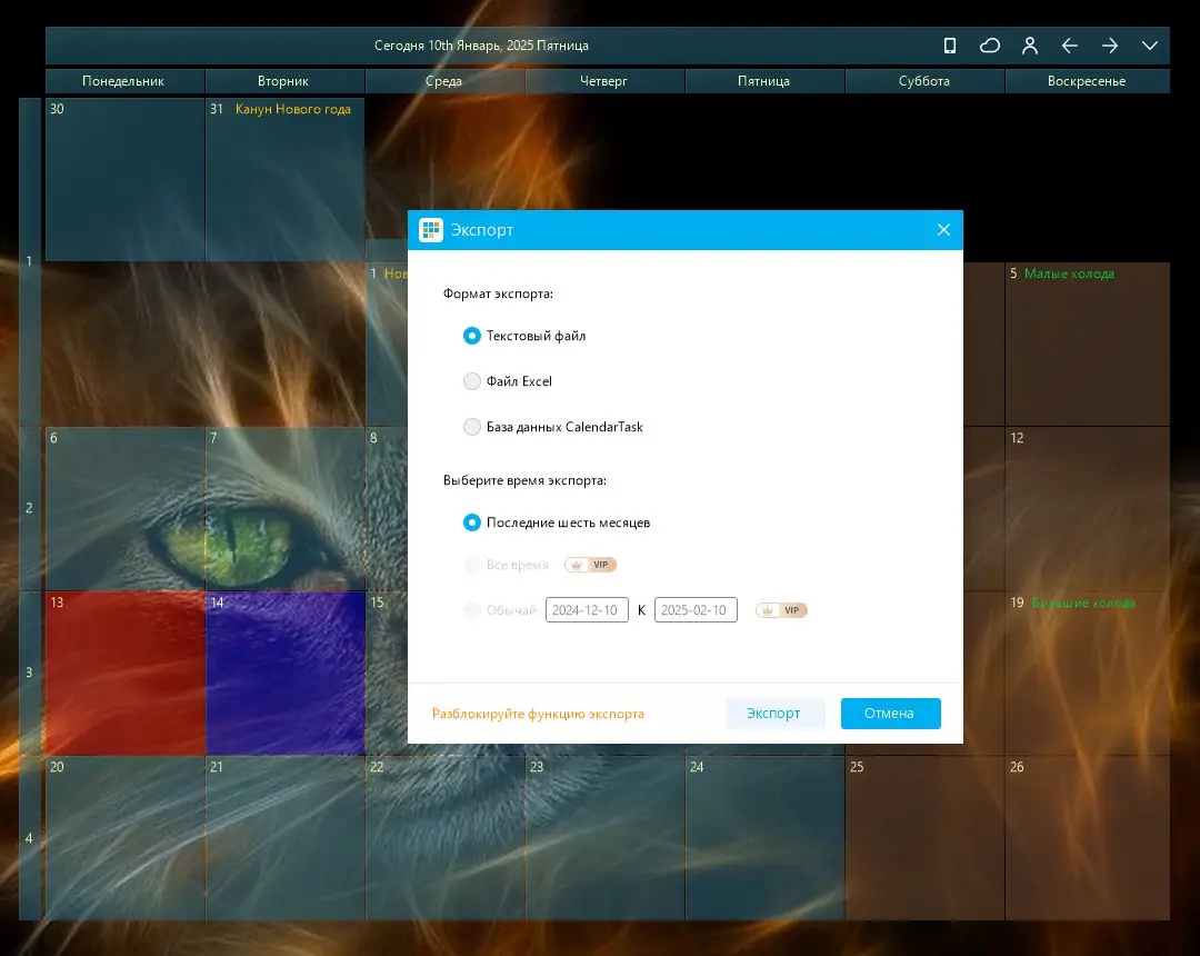 Использование приложения не требует специальных навыков. После запуска календарь появляется на рабочем столе в виде компактного окна, которое можно перемещать и изменять по размеру. Двойной щелчок по дате открывает режим редактирования, где можно добавить новое событие, запись или задачу. Каждое событие можно выделить определённым цветом, что особенно полезно при визуальном планировании. Для фиксации важных элементов, таких как заметки или напоминания, также используется двойной клик — объект остаётся поверх других окон. Настройки позволяют адаптировать внешний вид под предпочтения пользователя, включая прозрачность, шрифты и цветовую схему. Поддержка Windows 10 гарантирует корректную работу в современных системах с высоким разрешением экрана.