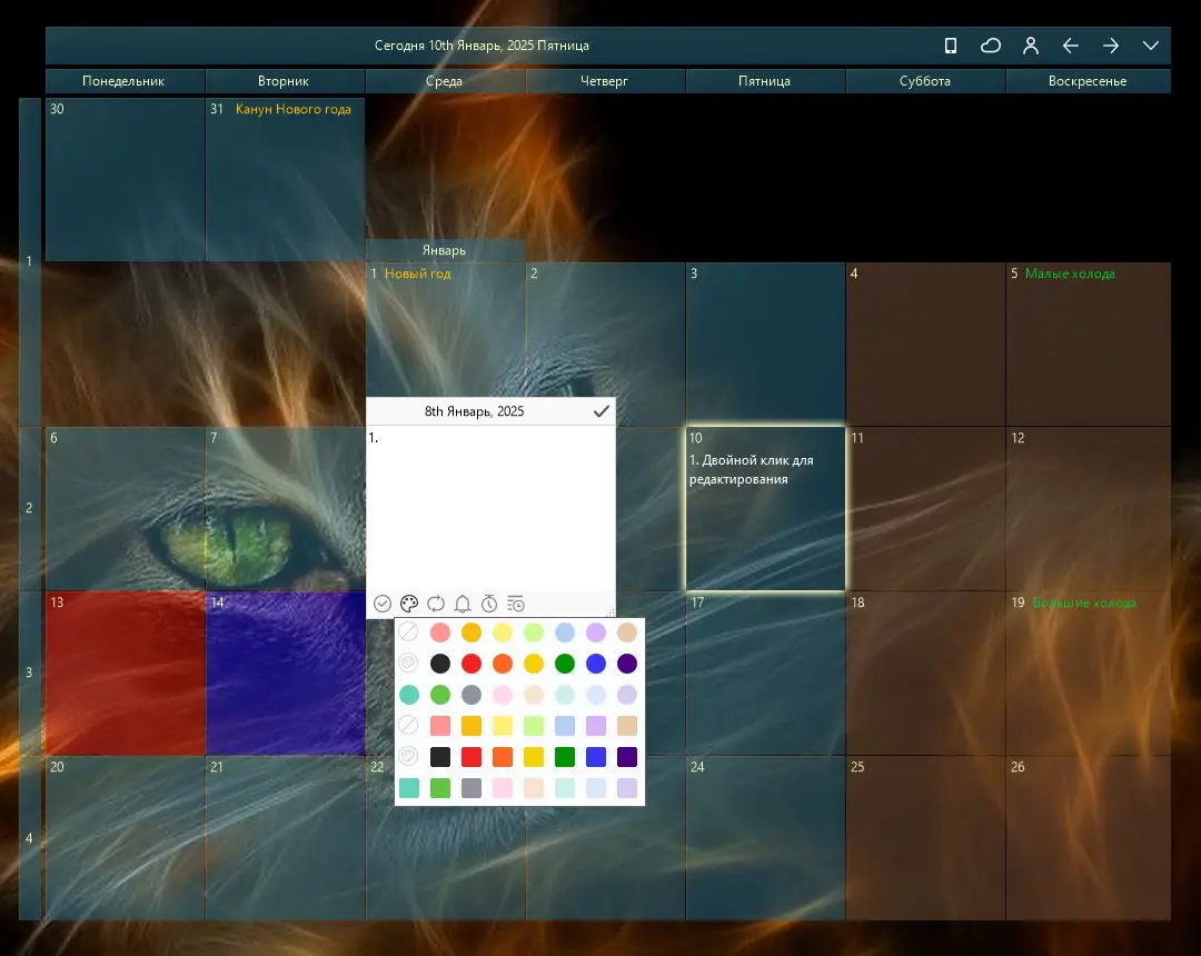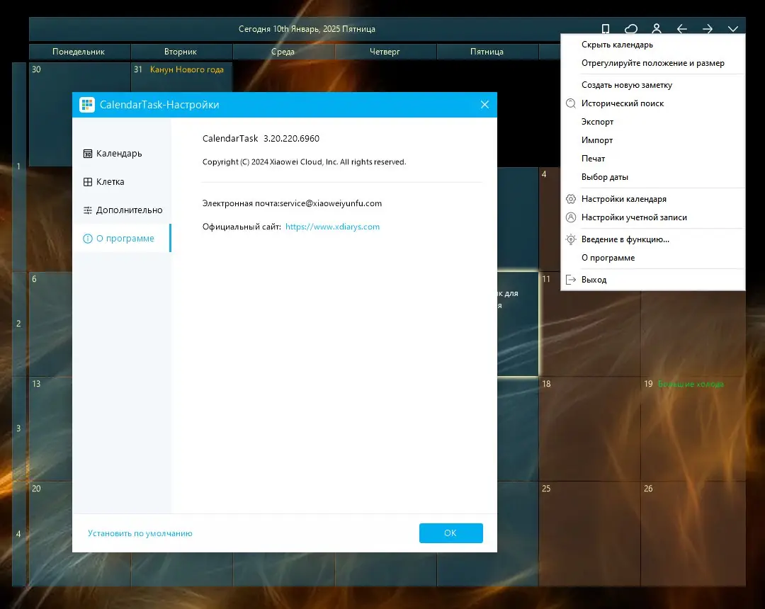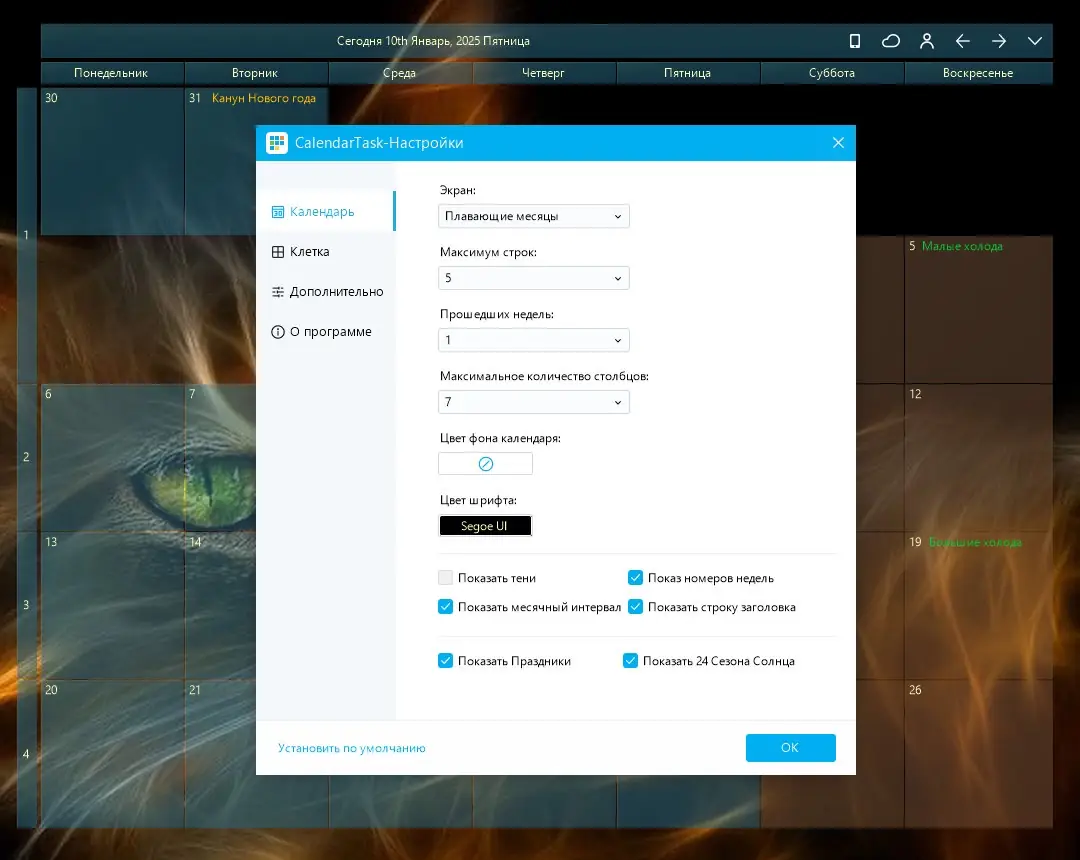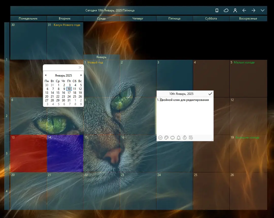 - Гибкая настройка внешнего вида и размера календаря на рабочем столе.