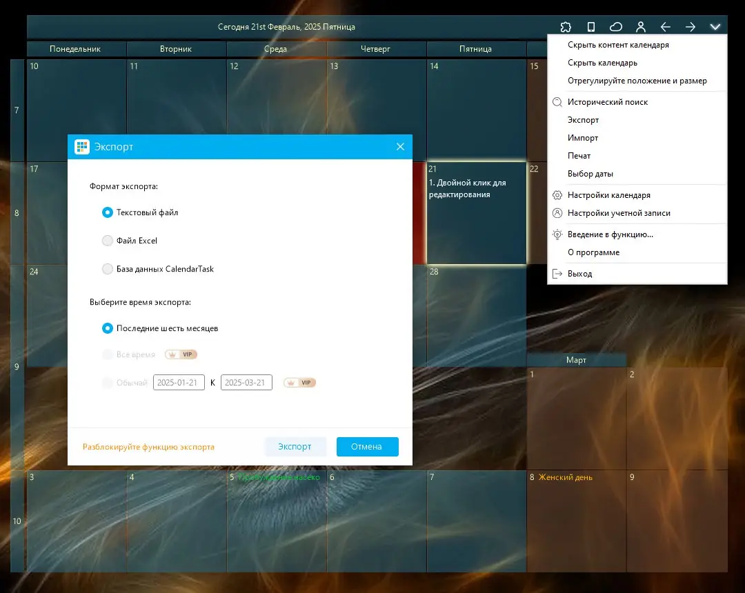 Управление программой интуитивно понятно и не требует специальных навыков. Достаточно установить приложение, и календарь появится на рабочем столе, не перекрывая другие элементы. Двойной щелчок по любой дате открывает окно редактирования, где можно добавить новую задачу, заметку или отметить важное событие. Для удобства пользователь может выделить особые дни цветом — например, красным для праздников, синим для рабочих встреч, зелёным для личных дел. Размер календаря регулируется простым растягиванием, что позволяет адаптировать его под разрешение экрана и личные предпочтения. Также доступна возможность закрепить любые важные объекты на видном месте монитора, чтобы они всегда оставались в зоне внимания. Все внесённые изменения сохраняются автоматически, а функция экспорта позволяет перенести данные на другое устройство или создать резервную копию.