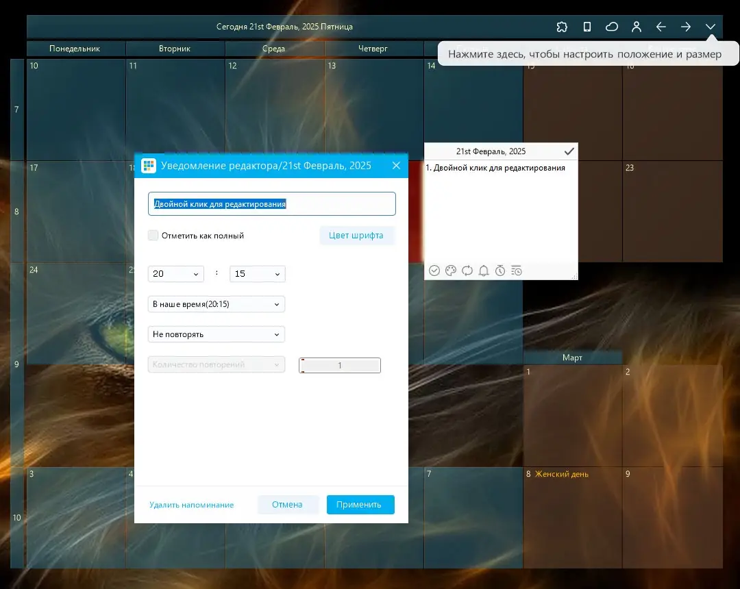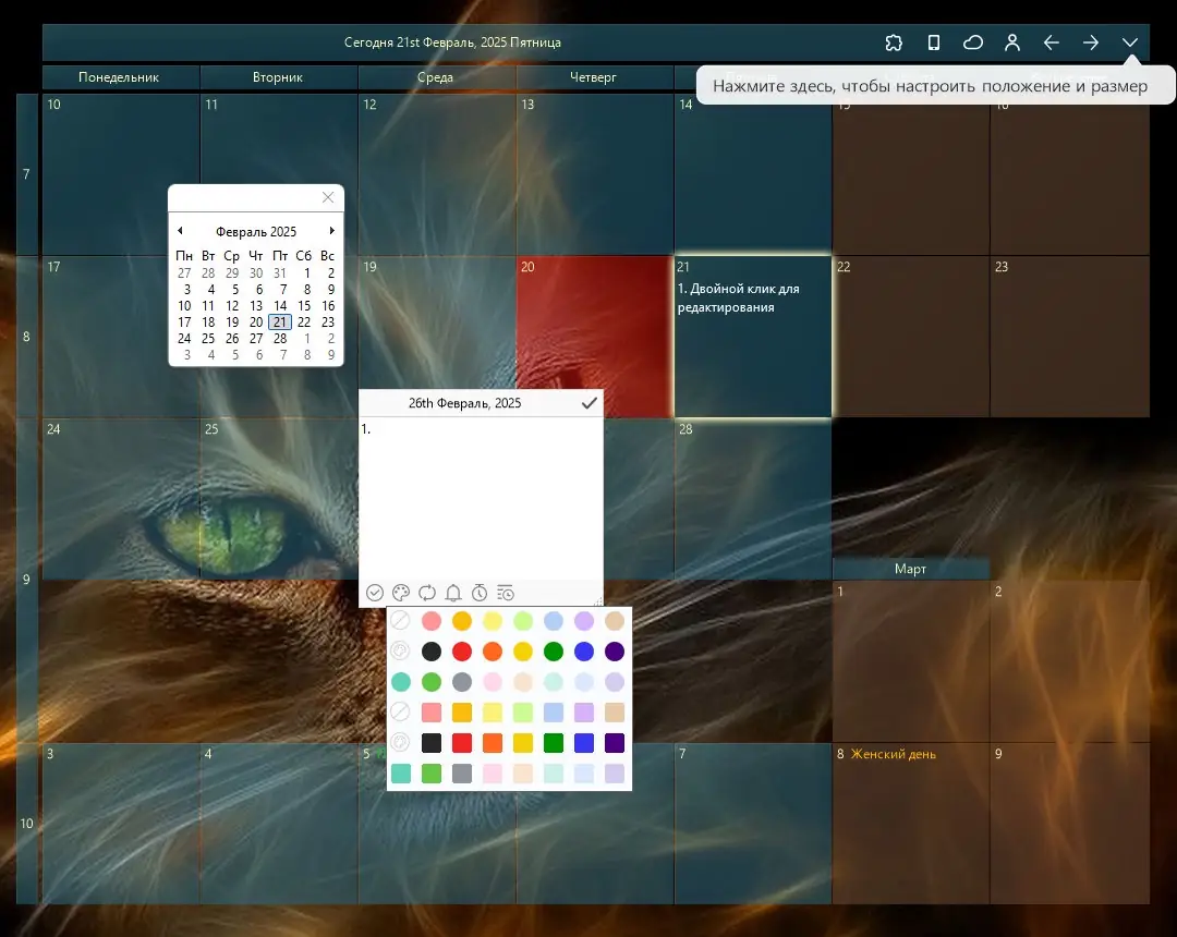 Desktop Calendar активно использует визуальные подсказки и гибкую настройку, чтобы пользователь мог легко ориентироваться в расписании и не упускать важные события.