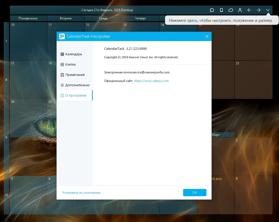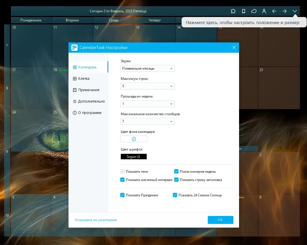 - Отображение календаря прямо на рабочем столе без необходимости запуска дополнительных окон.