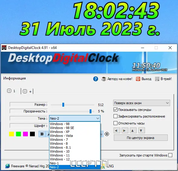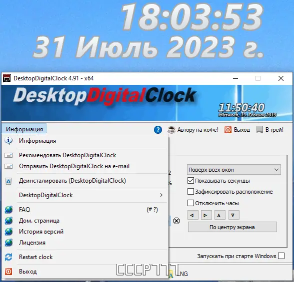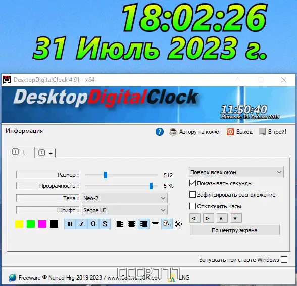 DesktopDigitalClock доступна для бесплатного использования и распространяется в портативной версии. Программа совместима с актуальными версиями Windows и не требует прав администратора для запуска. Благодаря компактному размеру и отсутствию зависимости от системных библиотек, её можно хранить на флеш-накопителе и использовать на любом компьютере.
