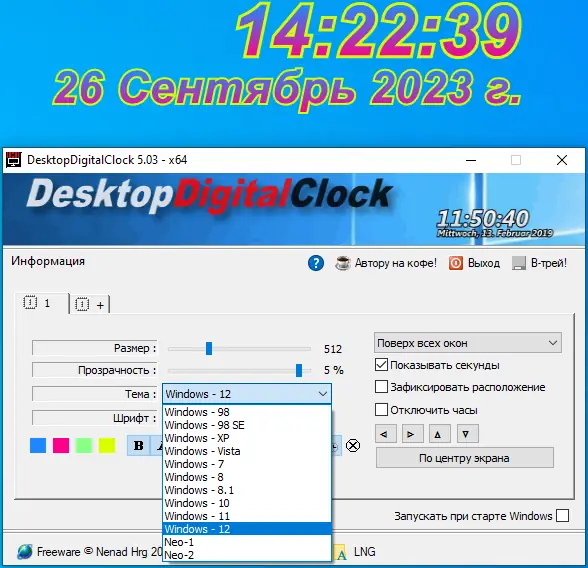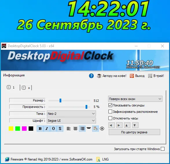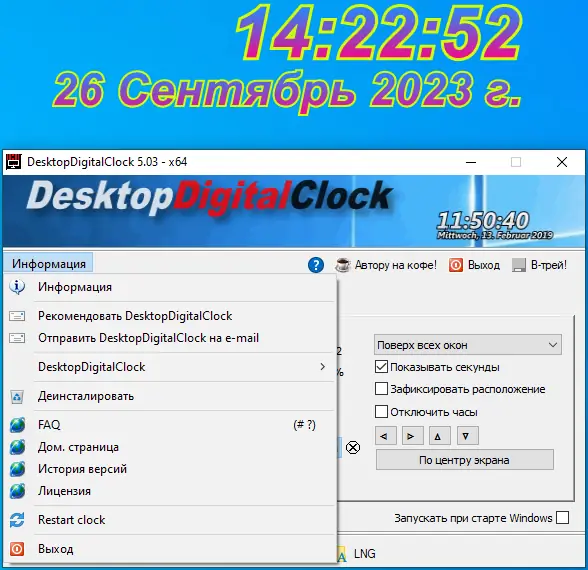 Использование программы интуитивно понятно и не требует изучения сложных интерфейсов. После запуска файл .exe появляются цифровые часы, которые можно перемещать по экрану с помощью перетаскивания. Через контекстное меню, вызываемое щелчком правой кнопки мыши, открывается доступ к настройкам: выбор темы, изменение шрифта, установка прозрачности и размера. Также можно включить режим фиксации в центре экрана или отключить возможность перемещения для предотвращения случайных сдвигов. Для смены языка достаточно выбрать нужный в разделе LNG, а портативная версия автоматически подхватывает конфигурацию из файла DesktopDigitalClock.ini, если он находится в той же папке.