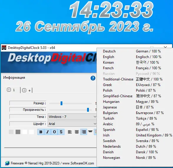 DesktopDigitalClock — это легковесное приложение для отображения цифровых часов прямо на рабочем столе. Программа предлагает широкие возможности настройки внешнего вида: выбор темы, регулировка прозрачности, изменение шрифта и расположения. Она не требует установки, работает в фоне с минимальным потреблением ресурсов и поддерживает множество языков, включая русский.