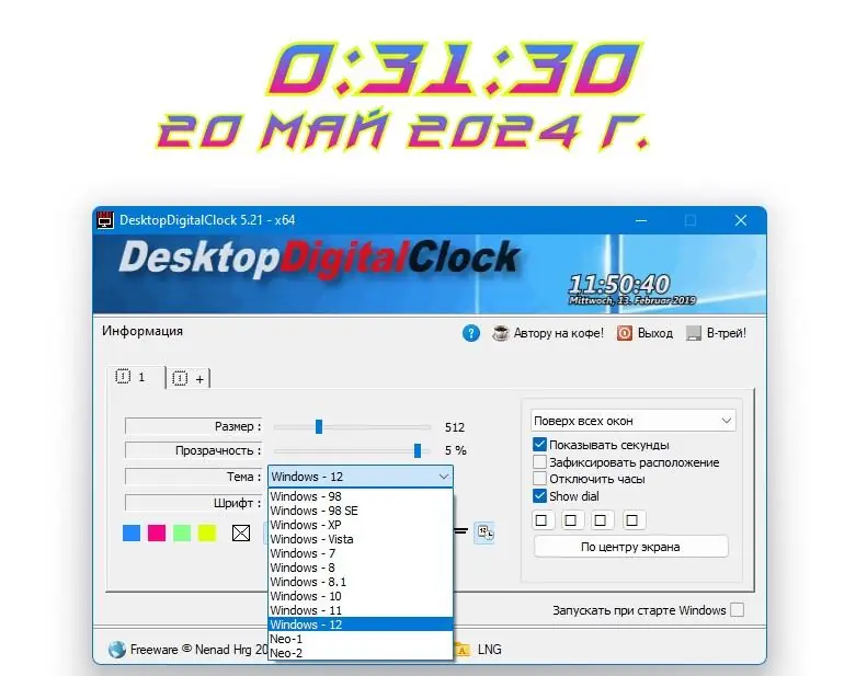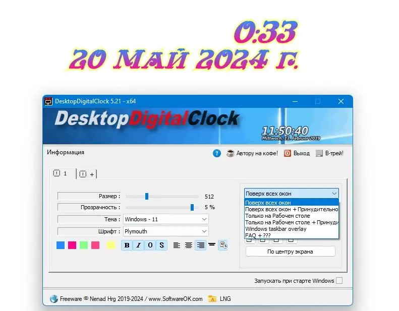 - Регулировка прозрачности окна часов в зависимости от фона рабочего стола
