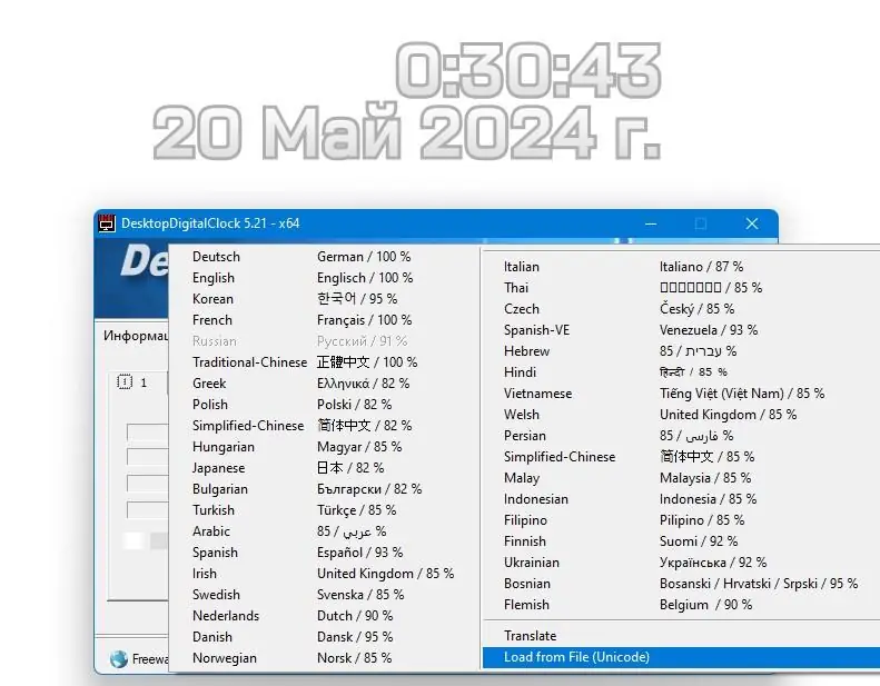 Запуск приложения происходит через исполняемый файл, после чего на экране появляется окно с цифровыми часами. Перемещение осуществляется перетаскиванием мышью, а контекстное меню вызывается правым кликом по часам. В меню доступны настройки: выбор темы, изменение шрифта, регулировка прозрачности, включение фиксации положения и переключение языка интерфейса. Для сохранения параметров используется конфигурационный файл DesktopDigitalClock.ini, который автоматически создаётся в папке %APPDATA% или в директории запуска в портативном режиме. Поддержка множества языков позволяет использовать программу без дополнительных модификаций.