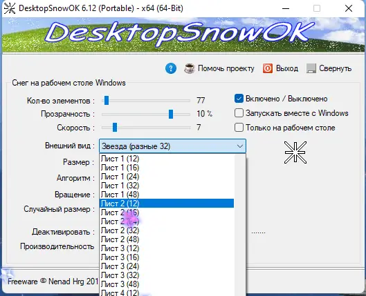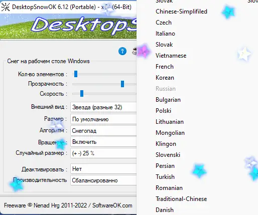 Запуск DesktopSnowOK происходит мгновенно — достаточно открыть исполняемый файл. После старта в трее появляется иконка программы, через которую осуществляется доступ к настройкам. Основное окно предоставляет ползунки для регулировки количества снежинок, их прозрачности и скорости падения. Пользователь может выбрать один из доступных типов снежинок, включая нестандартные варианты вроде шаров или геометрических фигур. Смена языка интерфейса производится через меню настроек, где доступен пункт «LNG» и опция «Русский». После внесения изменений эффект применяется сразу, без перезагрузки приложения. Для отключения анимации достаточно закрыть программу через контекстное меню в трее.
