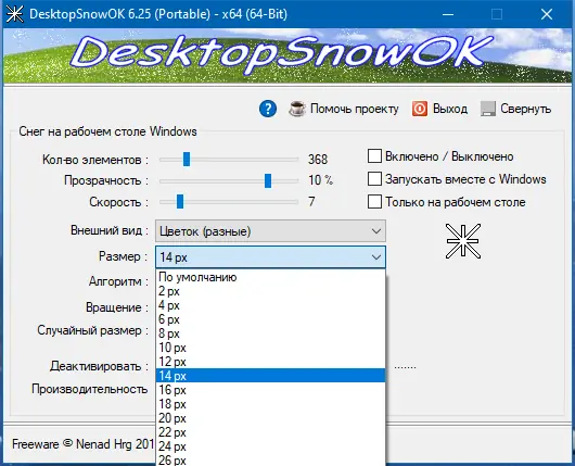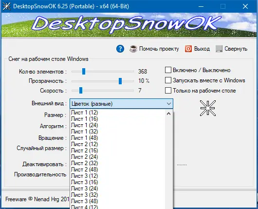 DesktopSnowOK — легкая портативная утилита, создающая эффект падающих снежинок на рабочем столе. Программа не требует установки, легко настраивается и поддерживает русский язык интерфейса.