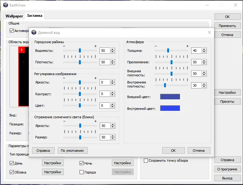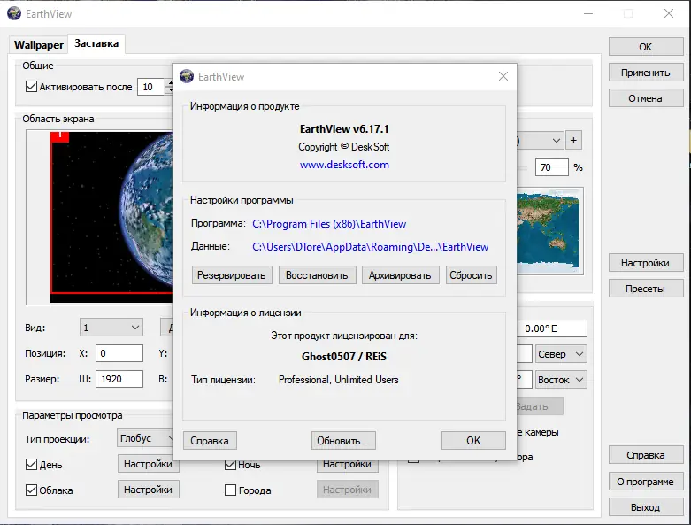 EarthView — динамические обои и хранитель экрана, отображающие Землю в высоком разрешении с реалистичными дневными и ночными тенями, атмосферными эффектами, облаками и городскими огнями. Программа поддерживает настройку под любой монитор, включая разрешения выше 4K.