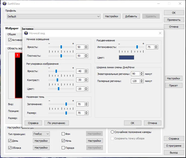 - Гибкая настройка отображения городских огней и населённых пунктов