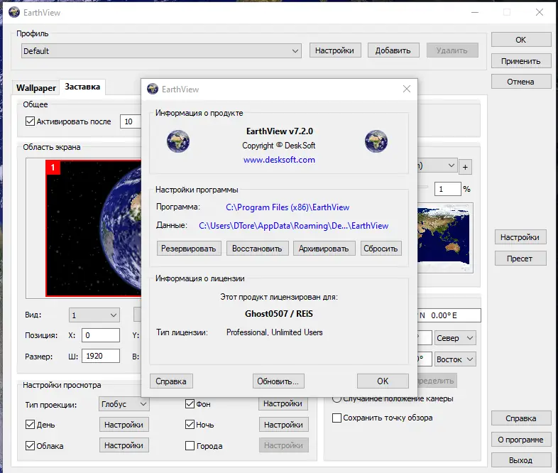 EarthView — это программное обеспечение, превращающее рабочий стол в живое изображение Земли, вращающейся в космосе. Программа использует спутниковые данные и картографические материалы для создания визуально насыщенных изображений, отражающих реальное положение теней, освещённости и погодных условий. Каждый запуск предлагает уникальную картинку, зависящую от текущего времени суток и географического положения.