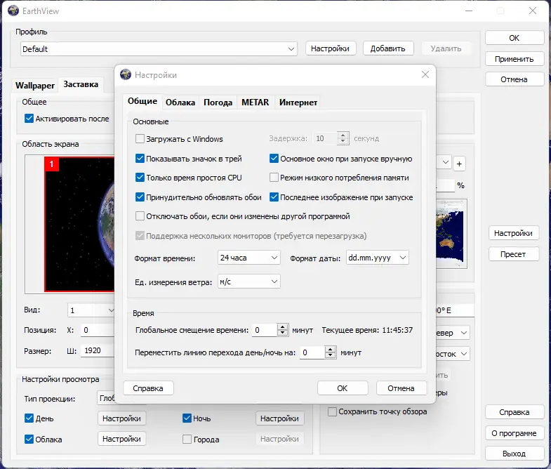 EarthView поддерживает работу на нескольких мониторах с независимыми настройками для каждого экрана, обеспечивая гибкость в использовании.