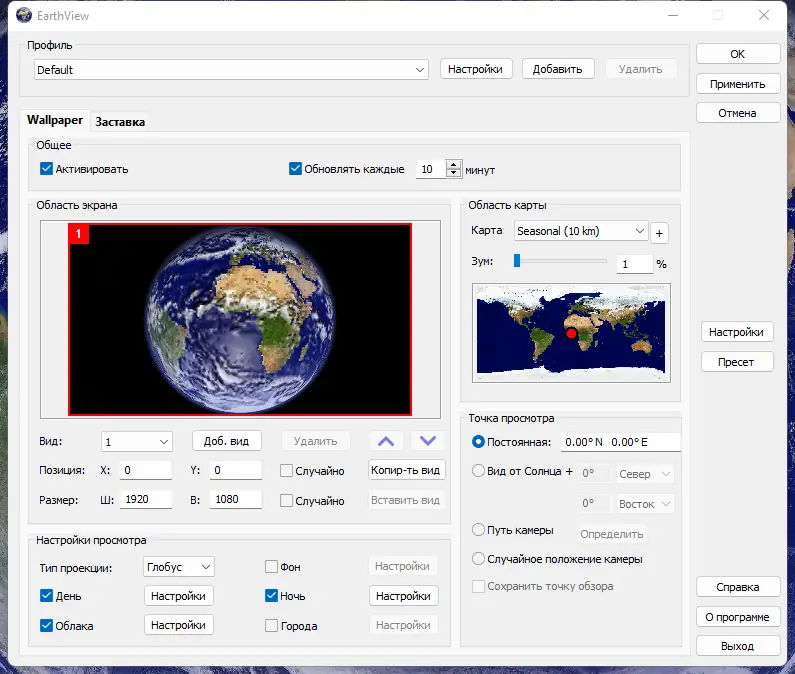 EarthView — программное обеспечение для создания динамических обоев и экранных заставок, отображающих Землю с реалистичными дневными и ночными эффектами. Приложение использует высокоточные картографические данные, атмосферные эффекты и актуальную информацию о погоде, обеспечивая живое и визуально насыщенное оформление рабочего стола. Поддержка высокого разрешения и возможность настройки под разные мониторы делают его идеальным решением для пользователей, ценящих качество и детализацию в визуальном контенте.