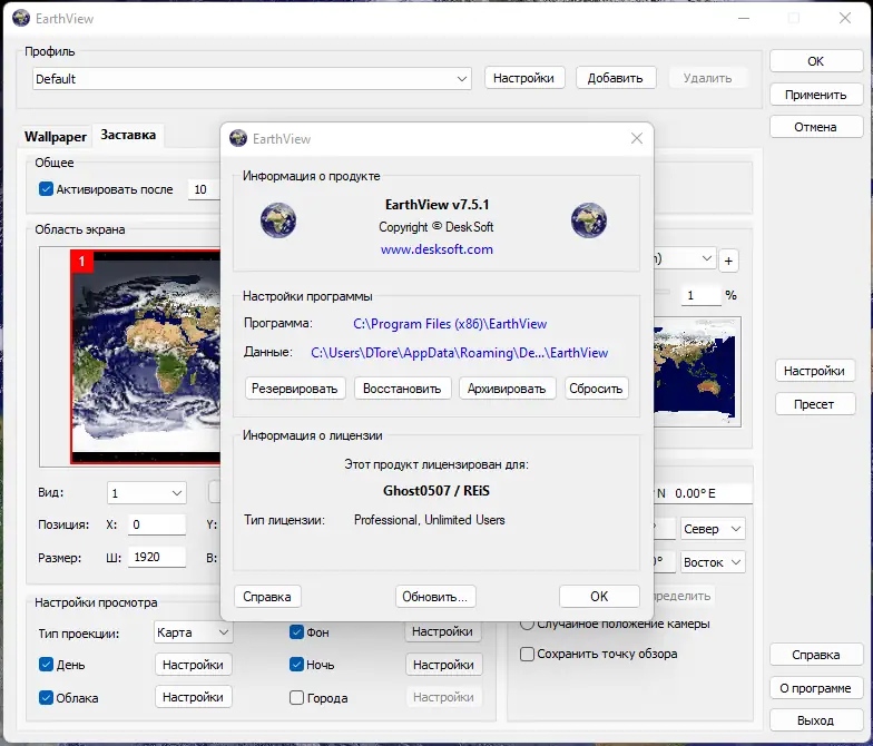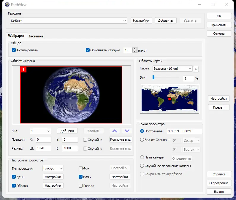 EarthView — это программа для создания динамических обоев и экранной заставки, отображающих Землю с реалистичными эффектами дня и ночи, атмосферными явлениями, облаками и городскими огнями. Она генерирует детализированные изображения планеты в высоком разрешении, поддерживает множество карт, сезонные изменения и данные о погоде, обеспечивая живое и визуально насыщенное оформление рабочего стола.