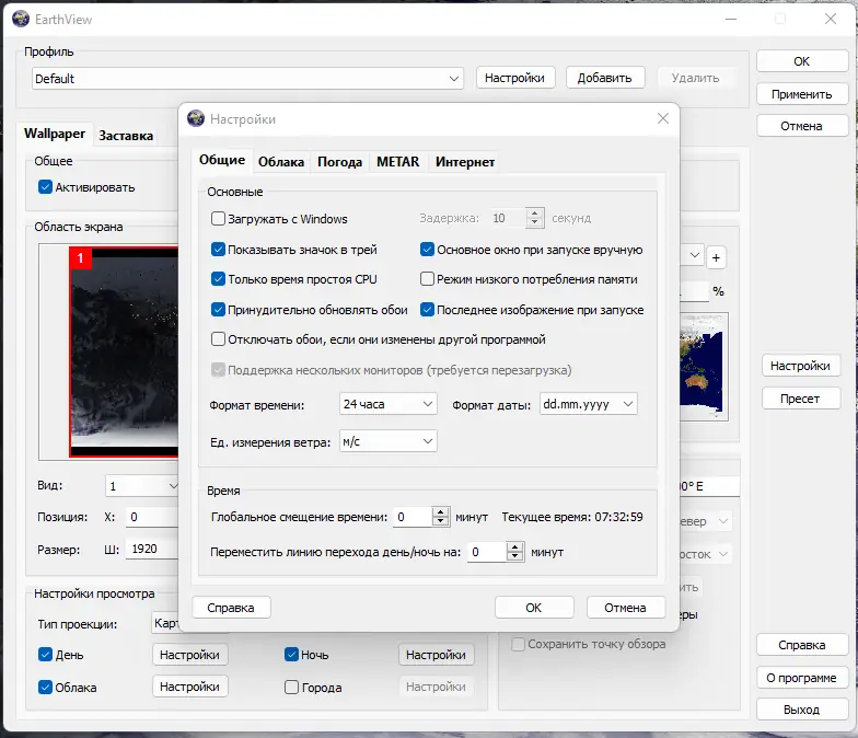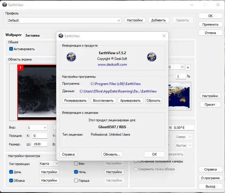 После установки EarthView настраивается через интуитивно понятный интерфейс, где доступны все параметры отображения. Пользователь может выбрать тип проекции — карта или глобус, включить атмосферные эффекты, облака и городские огни. Доступно более 140 000 городов с отображением местного времени и погодных условий, что делает программу полезной не только как декоративное решение, но и как информационный инструмент. Настройки сохраняются в .dcf-файлы, которые можно использовать для быстрого переноса конфигурации на другие устройства. Поддержка тихой установки с ключами /SILENT или /VERYSILENT позволяет использовать программу в корпоративной среде без необходимости ручного вмешательства.