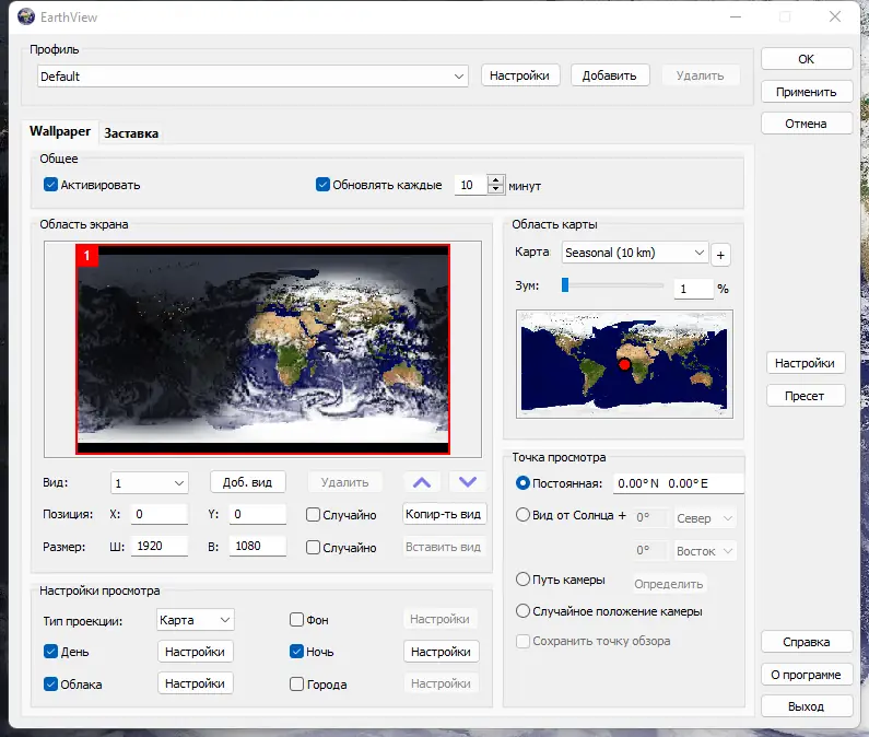 EarthView — это программное обеспечение для создания динамических обоев и экранной заставки, отображающих Землю с реалистичным дневным и ночным освещением. Приложение генерирует высококачественные изображения планеты с поддержкой высокого разрешения, включая 4K и выше. Благодаря детализированным картам, атмосферным эффектам и данным о погоде, программа преображает рабочий стол в живое пространство, отражающее текущее состояние планеты.