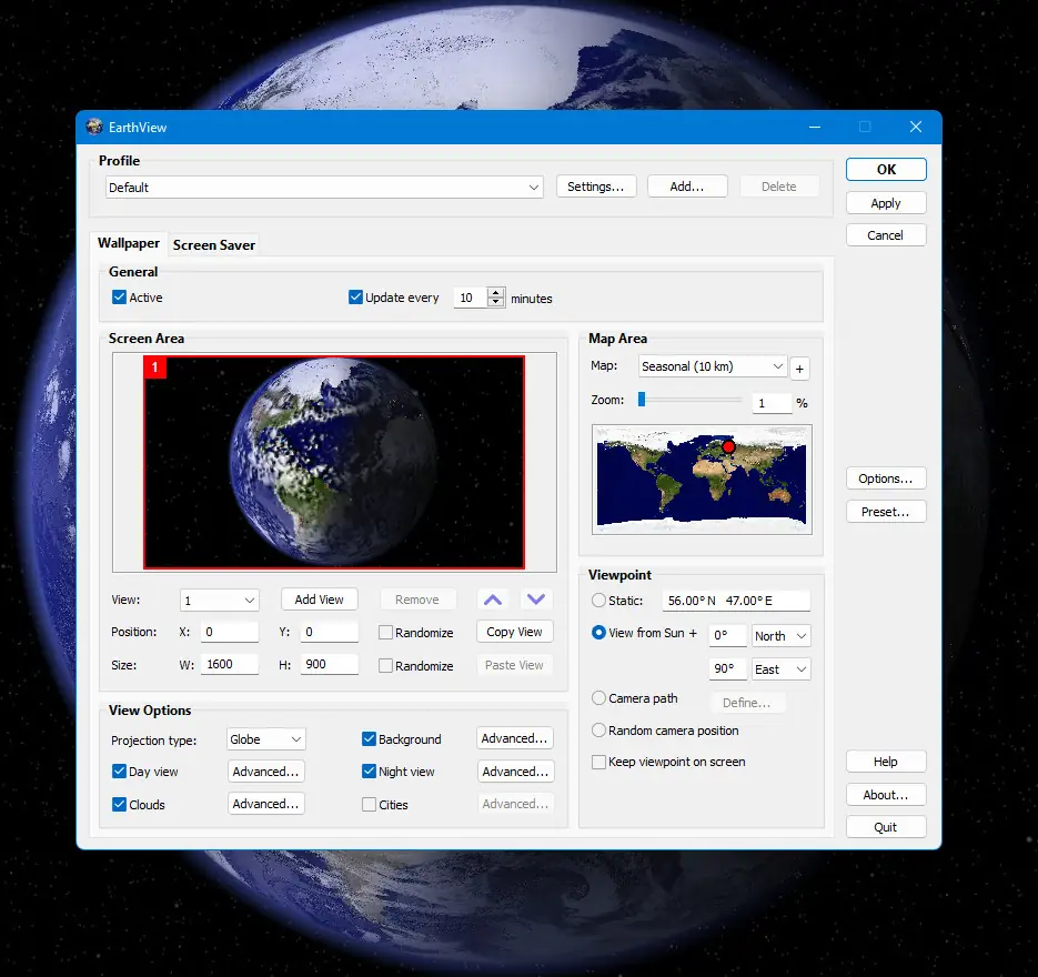EarthView — это динамические обои и хранитель экрана, отображающие Землю в высоком разрешении с реалистичными дневными и ночными тенями, атмосферными эффектами, облаками и городскими огнями. Программа поддерживает детализированные карты, сезонные изменения и данные о погоде, обеспечивая потрясающий визуальный опыт на любом мониторе.