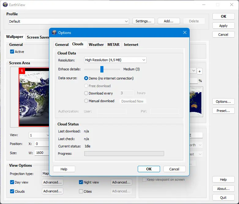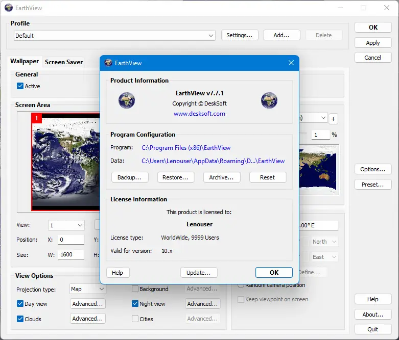 EarthView — это программное обеспечение, преобразующее рабочий стол в живое изображение планеты Земля. Оно отображает реалистичные виды нашей планеты с учётом времени суток, положения Солнца и текущих погодных условий. Пользователи могут наблюдать, как дневной свет постепенно сменяется ночными тенями, а города оживают яркими огнями. Программа поддерживает множество проекций, включая карту и глобус, и позволяет настраивать отображение в зависимости от личных предпочтений. EarthView работает как в режиме обоев, так и в режиме хранителя экрана, обеспечивая плавную анимацию и высокую детализацию изображения.