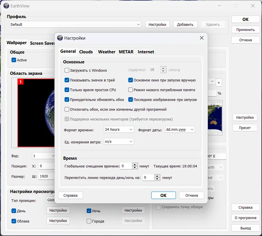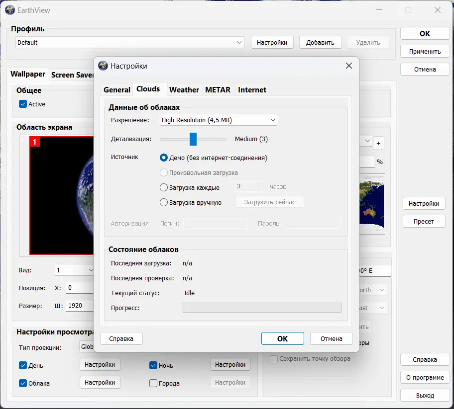 EarthView — это программа для отображения динамических обоев и экранных заставок, демонстрирующих Землю с реалистичными дневными и ночными тенями. Приложение генерирует высококачественные изображения в разрешении до 4K и выше, включая детализированные карты, атмосферные эффекты, облака, данные о погоде и световые отражения городов.