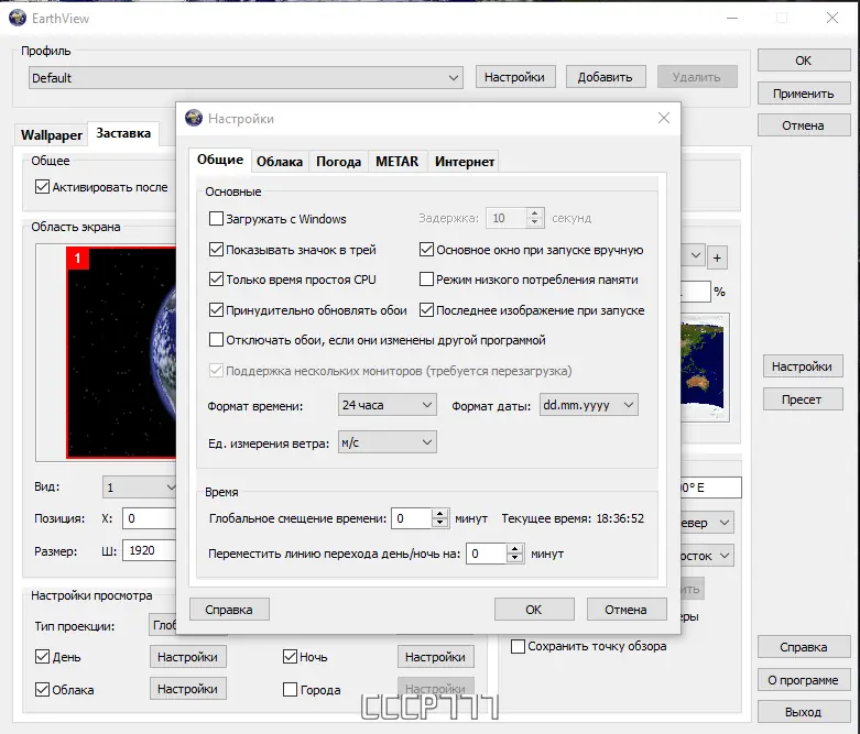 После установки программа автоматически запускается и начинает отображать текущий вид планеты. Через настройки можно выбрать тип проекции — глобус, карта Меркатора, ортографическая или стереографическая. Доступна ручная настройка масштаба, угла обзора и скорости вращения. Пользователь может включить отображение городов, местного времени, текущей погоды по данным METAR, а также добавить фоновые изображения, например, логотипы или фирменный стиль. Для автоматического запуска EarthView интегрируется в систему как обои рабочего стола или хранитель экрана. Поддержка тихой установки делает возможным массовое развёртывание в корпоративной среде без участия пользователя.