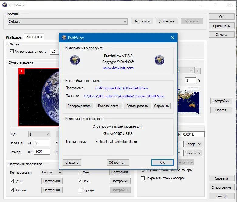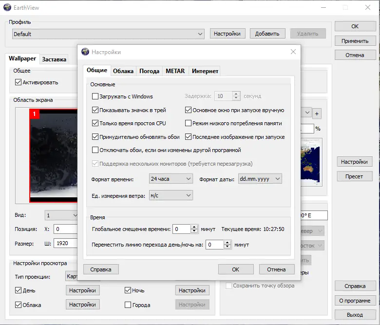 EarthView — это программное обеспечение для отображения высококачественных динамических обоев и заставок, показывающих Землю с космоса в реальном времени. Программа демонстрирует смену дня и ночи, атмосферные эффекты, облака, городские огни и сезонные изменения на поверхности планеты. Поддержка множества проекций, карт и настроек позволяет настроить отображение под любой вкус и разрешение экрана.