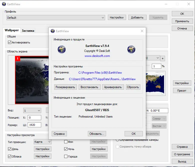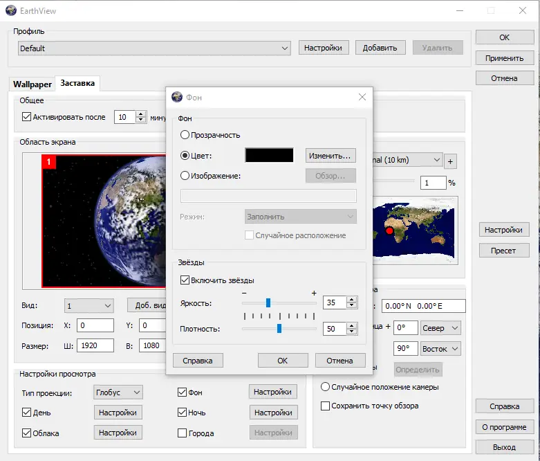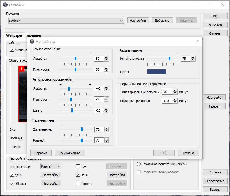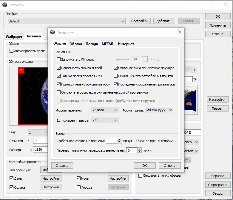 После установки EarthView можно настроить через встроенный интерфейс, где доступны параметры отображения, выбор карт, масштабирование и режимы обновления. Пользователь может включить отображение облачности, загружая актуальные спутниковые данные из интернета, или задать конкретный регион для фокусировки. Доступны настройки времени, отображения городов, часовых поясов и даже погодных условий в выбранных точках. Программа поддерживает режимы обоев и хранителя экрана, переключаемые в настройках Windows.