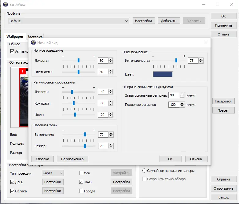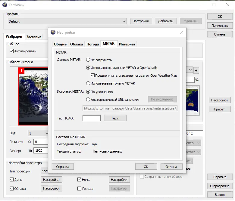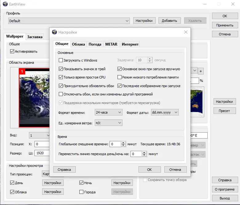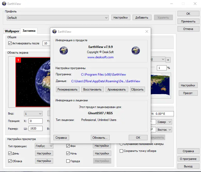 Использование EarthView не требует специальных навыков. После установки программа автоматически запускается в виде обоев или заставки, в зависимости от настроек. Пользователь может выбрать тип проекции — от плоской карты до объемного глобуса, настроить масштаб, скорость вращения и угол обзора. Дополнительно доступна загрузка высокодетальных карт, которые можно активировать в настройках, особенно в полной версии приложения. Настройки сохраняются в пользовательских .dcf файлах, что позволяет быстро переключаться между разными конфигурациями.