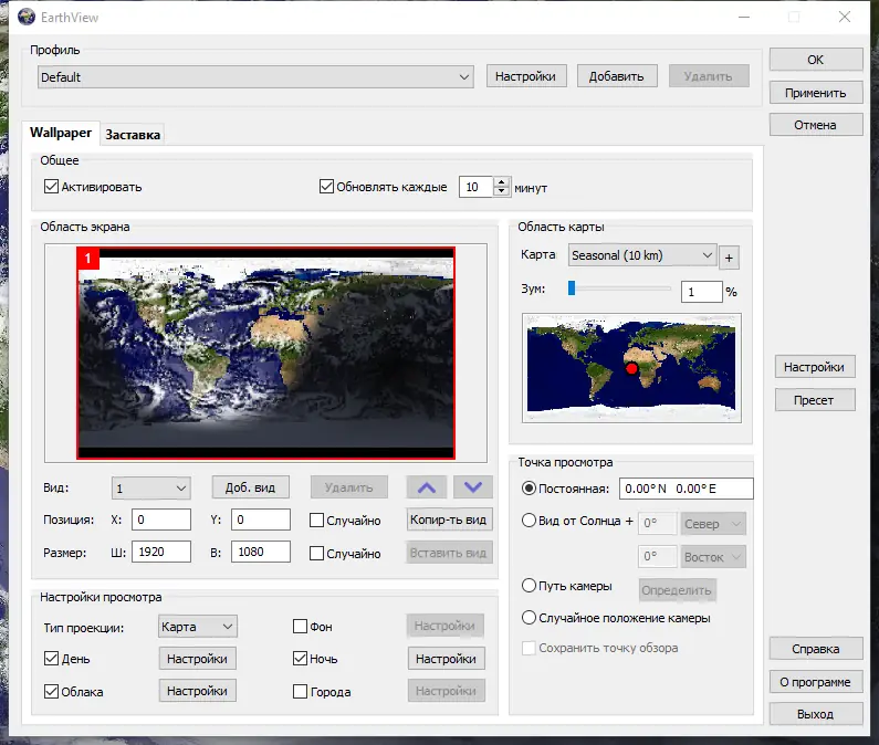 EarthView — это программное обеспечение для создания динамических обоев и экранных заставок, отображающих реалистичные виды Земли с учетом смены дня и ночи, атмосферных эффектов, облачности и сезонных изменений. Приложение генерирует высококачественные изображения в разрешениях до 4K и выше, поддерживая как картографические проекции, так и объемные модели планеты. Программа идеально подходит для пользователей, стремящихся украсить рабочий стол живыми, постоянно обновляющимися видами нашей планеты.